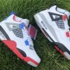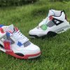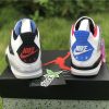 Releasing in random mismatched color blocking that includes a mix of White/Cement, Military Blue, Fire Red, and Black/Cement. This Air Jordan 4 comes complete with “Nike Air” branded heel tabs.