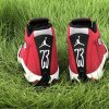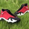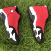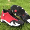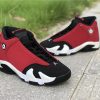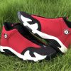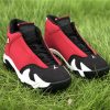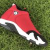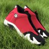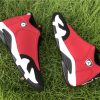 Dressed in a Black, Gym Red, White, and Off White colors scheme. This Air Jordan 14 features a Red upper with Black detailing on the toe box, sock liner, and heel completed with Off-White covering the midsole.