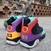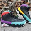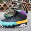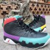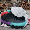 Dressed in Black, University Red, and Dark Concord color scheme. This Air Jordan 9 features a Black leather upper highlighted with Teal, Orange, and Purple riding up the mudguard and onto the heel. The classic “Dream It, Do It” label is used on the tongue to give off that vintage vibe.