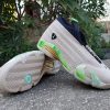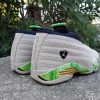 Dressed in a Light Bone and White color scheme. This low-top Air Jordan 14 features a Light Bone suede base with Black used on the tongue, laces, collar, and lining. Highlighting the shoe is a Green marbled print on the tongue and midsole along with a Metallic Gold shank plate. A Mint Green box with Aleali May’s signature and Gold tissue paper completes the design.
