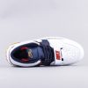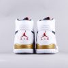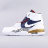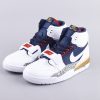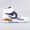 This Don C x Jordan Legacy 312 features a White leather upper with Midnight Navy, Varsity Red, and Gold accents giving off that Olympic vibe. Elephant print mudguards atop a solid White rubber sole completes the design.