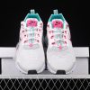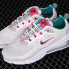This offering of the Nike Air Max 270 React features a White perforated mesh upper with suede overlays. Highlighting the shoe are Teal and Pink contrasting accents with “Max Air” logos on the tongues and insoles. A White React midsole atop a Black rubber outsole completes the design.