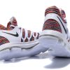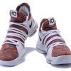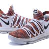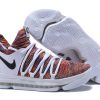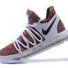 This Nike KD 10 comes dressed in a Multi-Color, Black and White color combination. The base features Flyknit throughout which utilizes the Multicolor theme. Following we have Grey which lands on the overlay, laces, tongue and collar area. Other details includes Black on the Nike Swoosh while White covers the midsole and outsole.