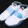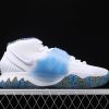 this Nike Kyrie 6 comes dressed in a White, Sapphire and Laser Orange color combination. Utilizing White across the upper along with mesh on the toe and Kyrie branding on the tongue. In addition we have translucent Blue on the mid-foot strap and outsole while a kaleidoscope inspired pattern covers the liner and outsole.